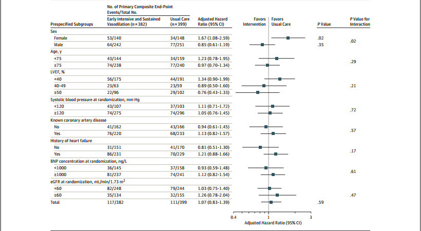 研究发现,在随机纳入的788例患者中,有781例(99.1%;中位数年龄为78岁;女性占36.9%)完成试验并符合主要终点的分析条件。其中779名患者(99.7%)完成180天随访。主要终点是急性心衰患者180天全因死亡率和再入院治疗,干预组(包括死亡病例55例,[14.4%])中为117例(30.6%);常规治疗组(包括死亡病例61例[15.3%])为111例(27.8%)(主要终点的绝对差值为2.8%[95%CI,-3.7%-9.3%]);(调整后危险比为1.07[95%CI, 0.83-1.39];P=0.59)。早期强化、持续扩血管治疗策略与常规治疗策略一般临床不良事件:低钾血症(23% VS 25%),肾功能恶化(21% VS 20%),头痛(26% VS 10%),头晕(15% VS 10%),低血压(8% VS 2%)。