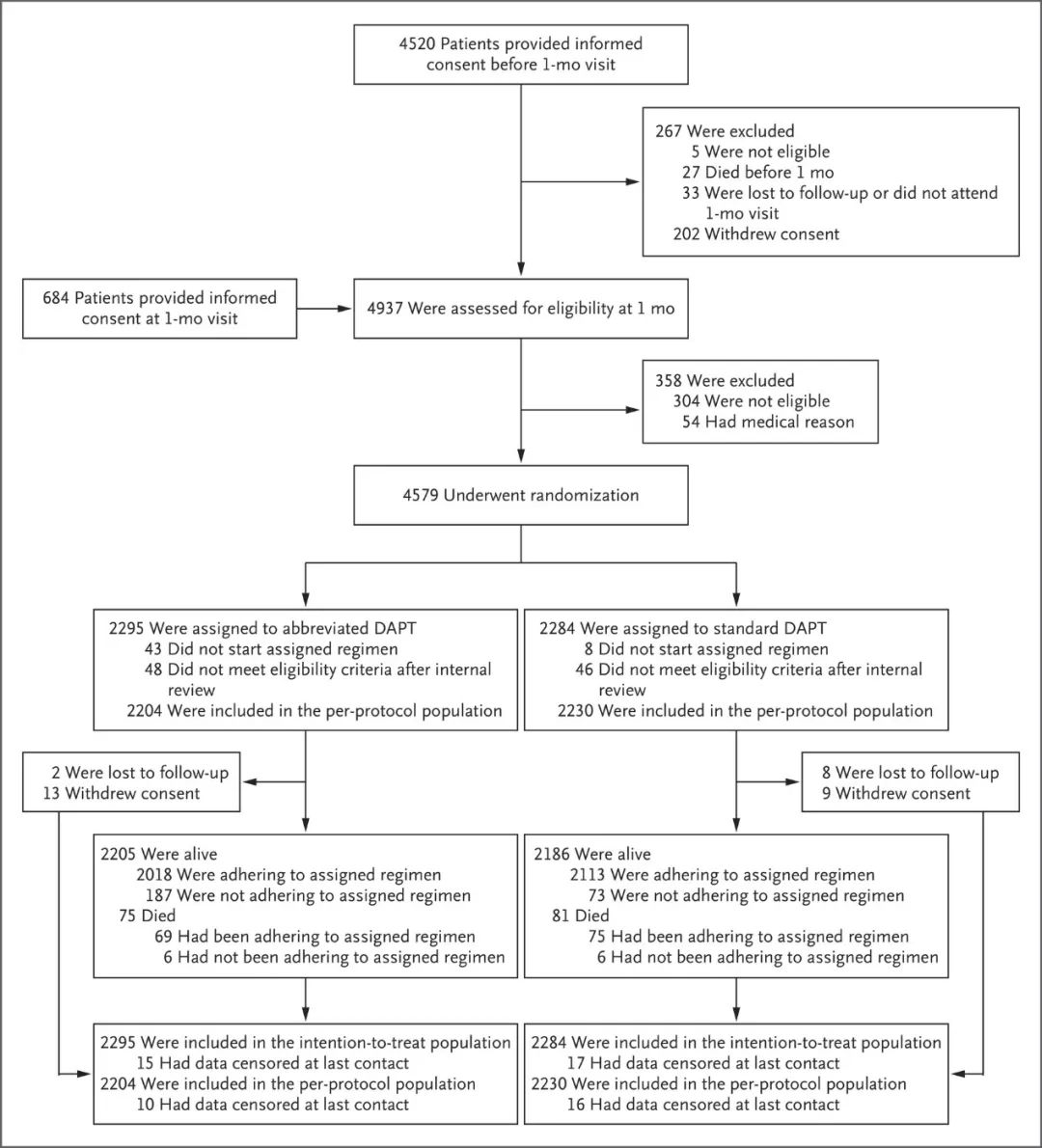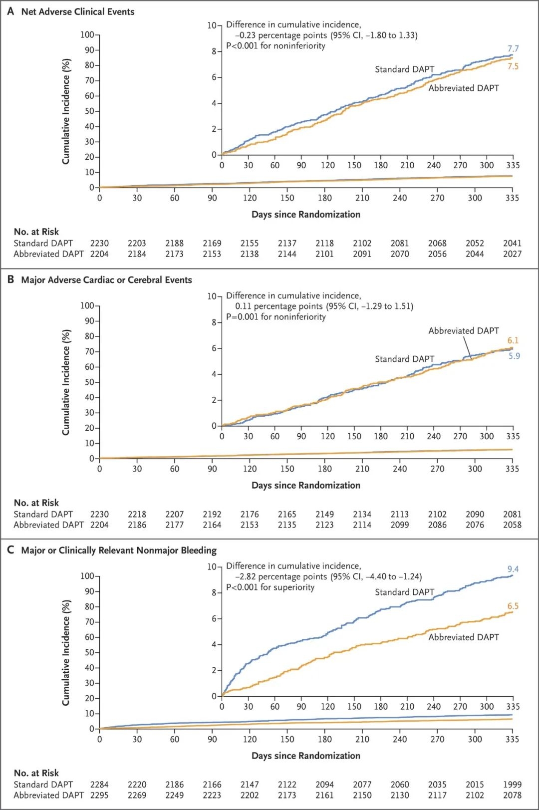 Results Among the 4434 patients in the per-protocol population, net adverse clinical events occurred in 165 patients (7.5%) in the abbreviated-therapy group and in 172 (7.7%) in the standard-therapy group (difference, −0.23 percentage points; 95% confidence interval [CI], −1.80 to 1.33; P<0.001 for noninferiority). A total of 133 patients (6.1%) in the abbreviated-therapy group and 132 patients (5.9%) in the standard-therapy group had a major adverse cardiac or cerebral event (difference, 0.11 percentage points; 95% CI, −1.29 to 1.51; P=0.001 for noninferiority). Among the 4579 patients in the intention-to-treat population, major or clinically relevant nonmajor bleeding occurred in 148 patients (6.5%) in the abbreviated-therapy group and in 211 (9.4%) in the standard-therapy group (difference, −2.82 percentage points; 95% CI, −4.40 to −1.24; P<0.001 for superiority).