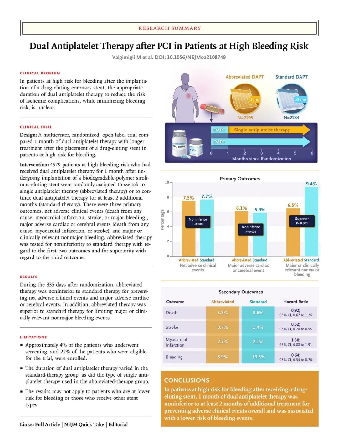 Methods One month after they had undergone implantation of a biodegradable-polymer sirolimus-eluting coronary stent, we randomly assigned patients at high bleeding risk to discontinue dual antiplatelet therapy immediately (abbreviated therapy) or to continue it for at least 2 additional months (standard therapy). The three ranked primary outcomes were net adverse clinical events (a composite of death from any cause, myocardial infarction, stroke, or major bleeding), major adverse cardiac or cerebral events (a composite of death from any cause, myocardial infarction, or stroke), and major or clinically relevant nonmajor bleeding; cumulative incidences were assessed at 335 days. The first two outcomes were assessed for noninferiority in the per-protocol population, and the third outcome for superiority in the intention-to-treat population. 方法在置入生物可降解聚合物西罗莫司洗脱冠状动脉支架1个月后,Marco Valgimigli团队随机将高出血风险患者分配到立即停止双重抗血小板治疗组(简化治疗)或继续治疗至少2个月的治疗组(标准治疗)。在335天时评估累积发生率,排名前三的主要结果是净不良临床事件(包括全因死亡、心肌梗死、卒中或大出血)、重大不良心脑血管事件(包括全因死亡、心肌梗死或卒中)以及大出血或临床相关的非大出血事件。前两个结果在符合方案人群中评估非劣效性,第三个结果在意向治疗人群中评估优效性。