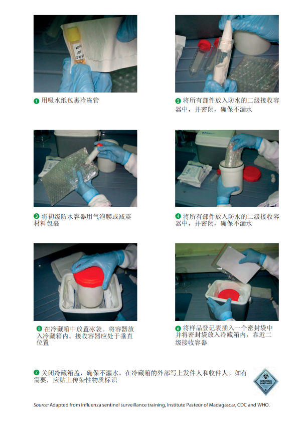 打包标本时,盛放容器中不应超过500毫升。从采样现场到实验室运输时,必须使用三层包装,以保护标本在运输过程中不被破坏。