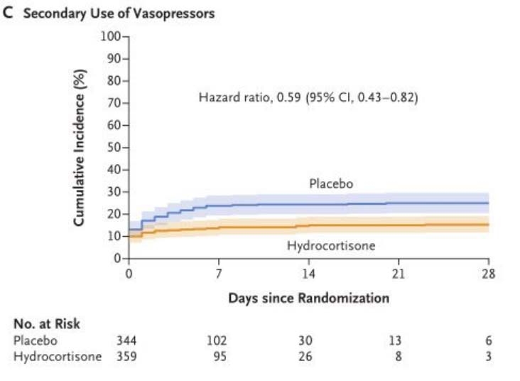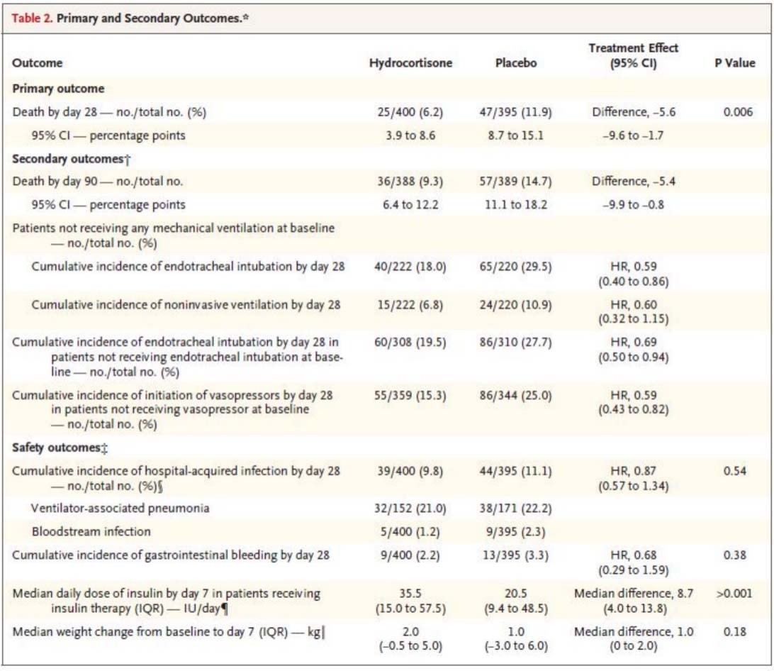 本研究在第二次计划的中期分析后结束,共800名患者接受了随机分组,分析了795例患者的数据。到第28天,氢化可的松组400例患者中有25例死亡,安慰剂组395例患者中有47例死亡(6.2% vs. 11.9%; P = 0.006)。在基线时未接受机械通气的患者中,氢化可的松组222例患者中有40例(18.0%)进行了气管插管,安慰剂组220例患者中有65例(29.5%)进行了气管插管(RR 0.59; 95% CI 0.40 ~ 0.86)。在基线时未接受血管升压药物的患者中,氢化可的松组359例患者中有55例(15.3%)在28天应用该种治疗,安慰剂组344例患者中有86例(25.0%)开始这种治疗(RR 0.59; 95% CI 0.43 ~ 0.82)。两组患者医院获得性感染和消化道出血的发生率相似;氢化可的松组的患者在治疗的第一周接受了更高剂量的胰岛素。