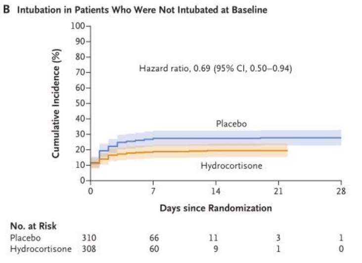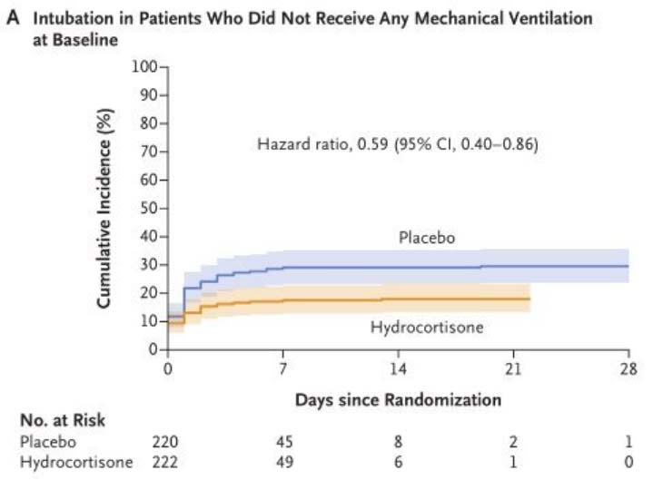 在ICU治疗的严重社区获得性肺炎患者中,接受氢化可的松治疗的患者在第28天的死亡风险低于接受安慰剂治疗的患者。(法国卫生部资助;NCT02517489)
