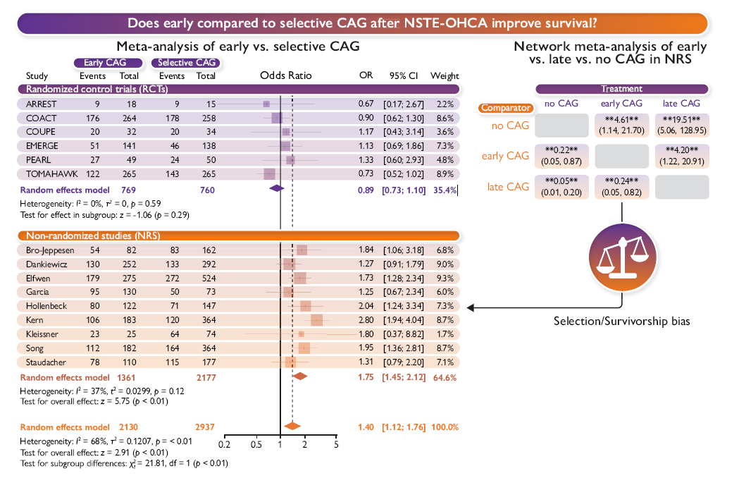 A systematic literature search was performed using the EMBASE, MEDLINE and Web of Science databases without restrictions on publication date. The last search was performed on 15 July 2022. Randomized controlled trials (RCTs) and non-randomized studies (NRS) comparing the effect of early CAG to selective CAG after NSTE-OHCA on survival and/or neurological outcomes were included. Meta-analyses were performed based on a DerSimonian-Laird random effects model. A total of 18 studies were identified by the literature search. After the exclusion of two studies due to high risk of bias, 16 studies (six RCTs, ten NRS) were included in the final analyses. Meta-analyses showed a statistically significant increase in survival after early CAG compared with selective CAG in the overall analysis [OR: 1.40, 95% confidence interval (CI): (1.12-1.76), P < 0.01, I2 = 68%]. This effect was lost in the subgroup analysis of RCTs [OR: 0.89, 95% CI: (0.73-1.10), P = 0.29, I2 = 0%]. Random effects model network meta-analysis of NRS based on a Bayesian method showed statistically significant increased survival after late compared with early CAG [OR: 4.20, 95% CI: (1.22, 20.91)].