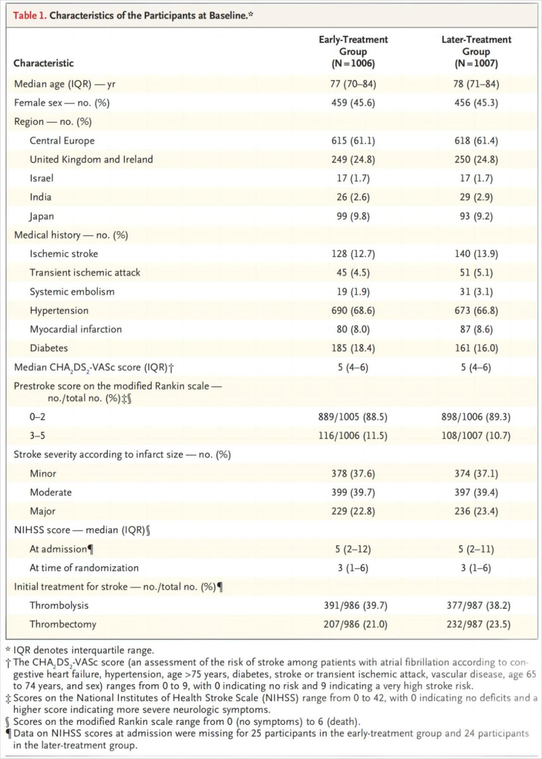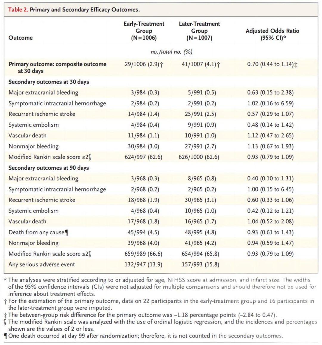 在2013例受试者中(37%轻度卒中,40%中度卒中,23%重度卒中),1006例被分配接受早期抗凝治疗,1007例被分配接受晚期抗凝治疗。早期治疗组有29名参与者(2.9%)发生主要结局事件,晚期治疗组有41名参与者(4.1%)发生主要结局事件(风险差异,-1.18个百分点; 95%置信区间[CI],-2.84至0.47)。早期治疗组有14名参与者(1.4%)和晚期治疗组有25名参与者(2.5%)发生了复发性缺血性卒中(比值比,0.57; 95%CI,0.29 - 1.07),90天时分别有18例(1.9%)和30例(3.1%)受试者(优势比,0.60; 95%CI,0.33至1.06)。30天时,两组中均有2例受试者(0.2%)发生症状性颅内出血。