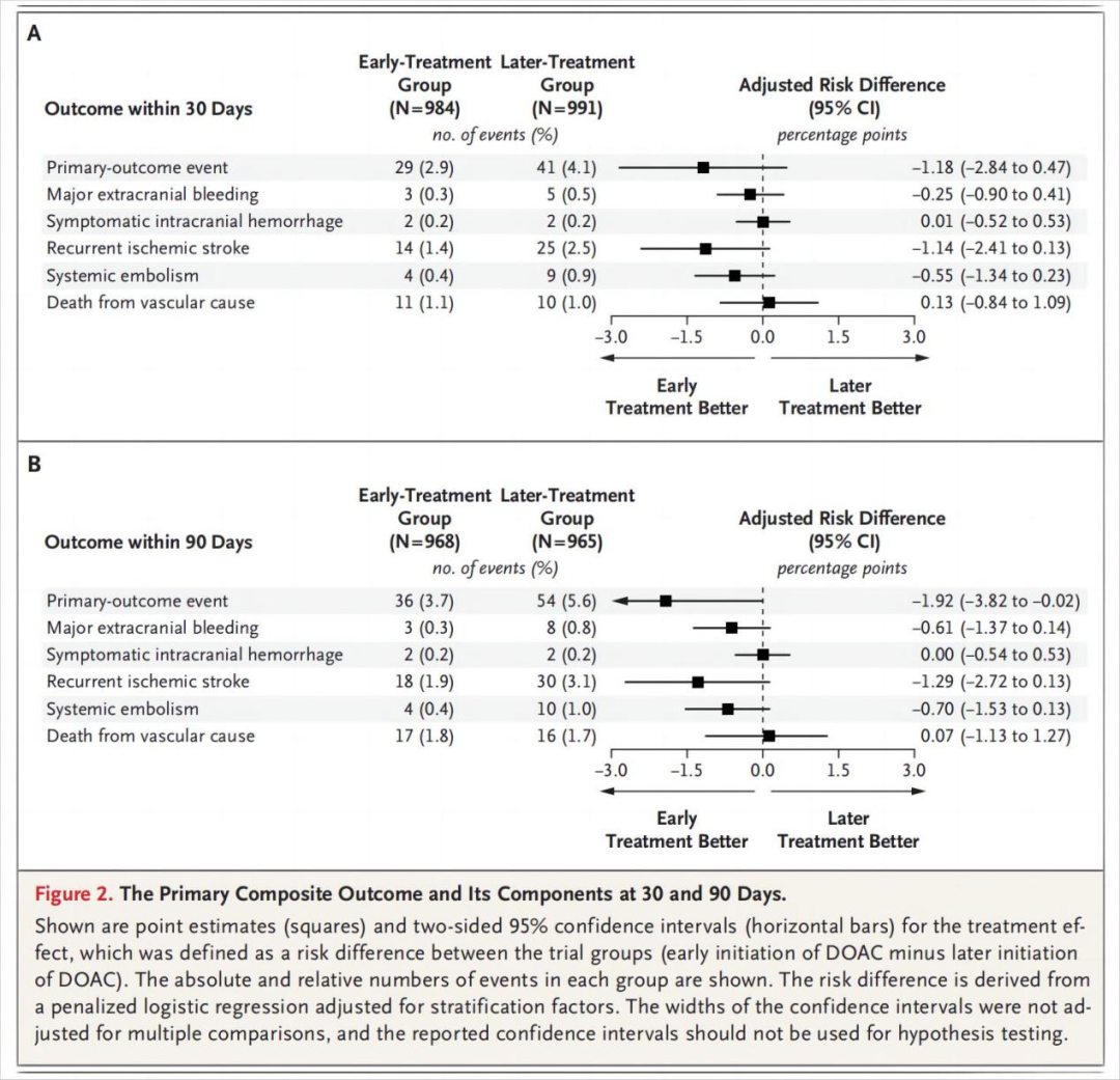 在本试验中,早期使用DOAC的30天时复发性缺血性卒中、全身性栓塞、颅外大出血、症状性颅内出血或血管性死亡的发生率估计范围为2.8个百分点至0.5个百分点(基于95%置信区间)。(由瑞士国家科学基金会等资助; ELAN ClinicalTrials.gov编号,NCT 03148457。)
