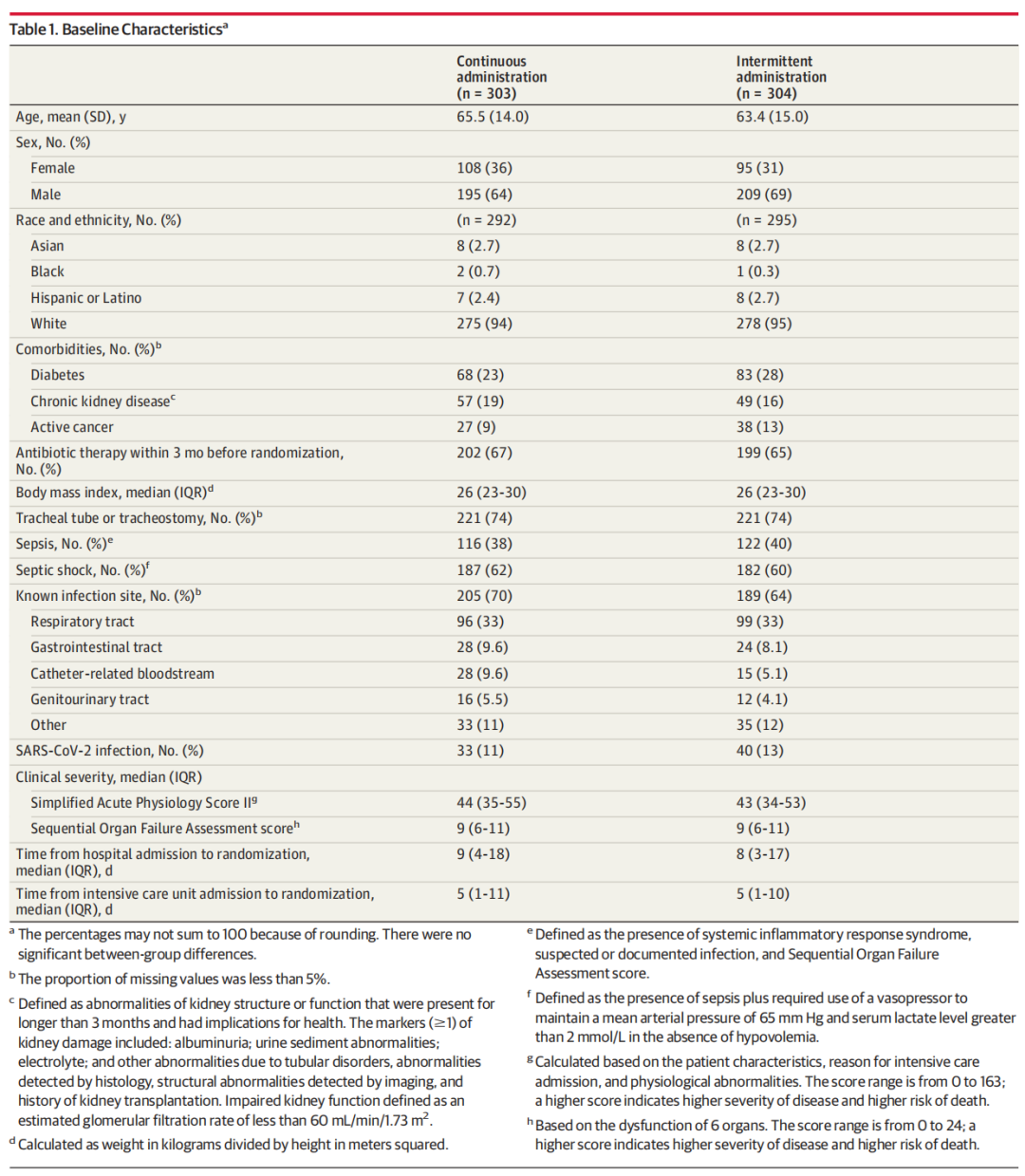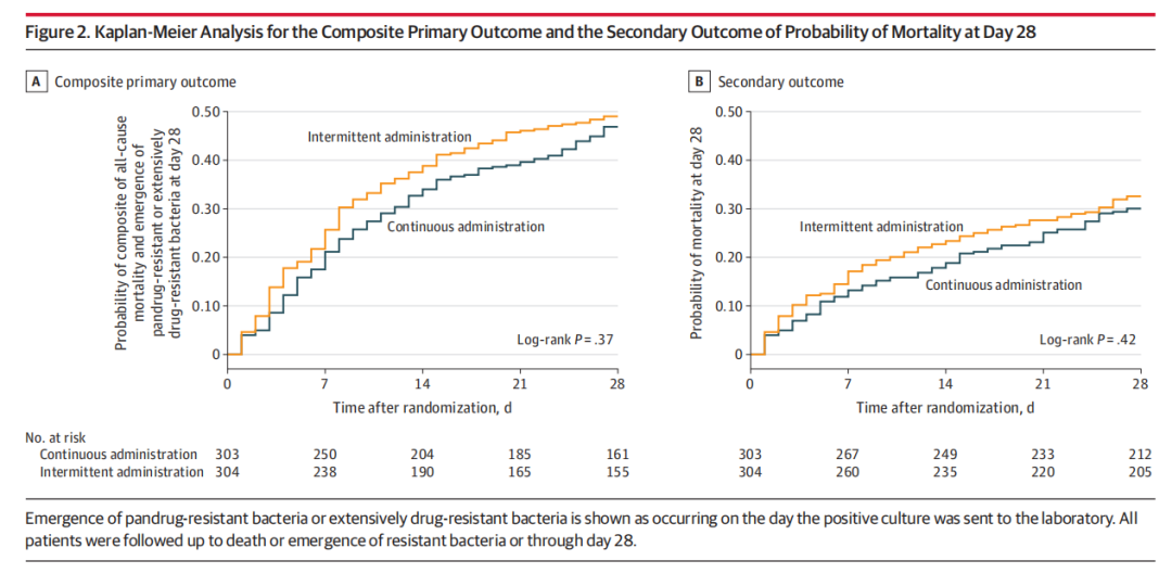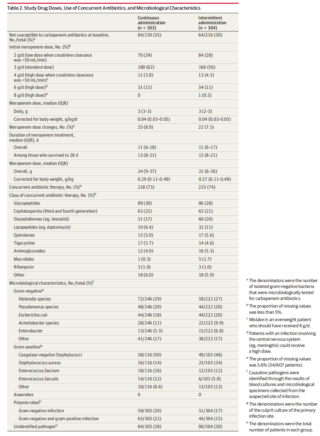 患者随机接受相同剂量的抗生素美罗培南连续给药(n = 303)或间歇给药(n = 304)。