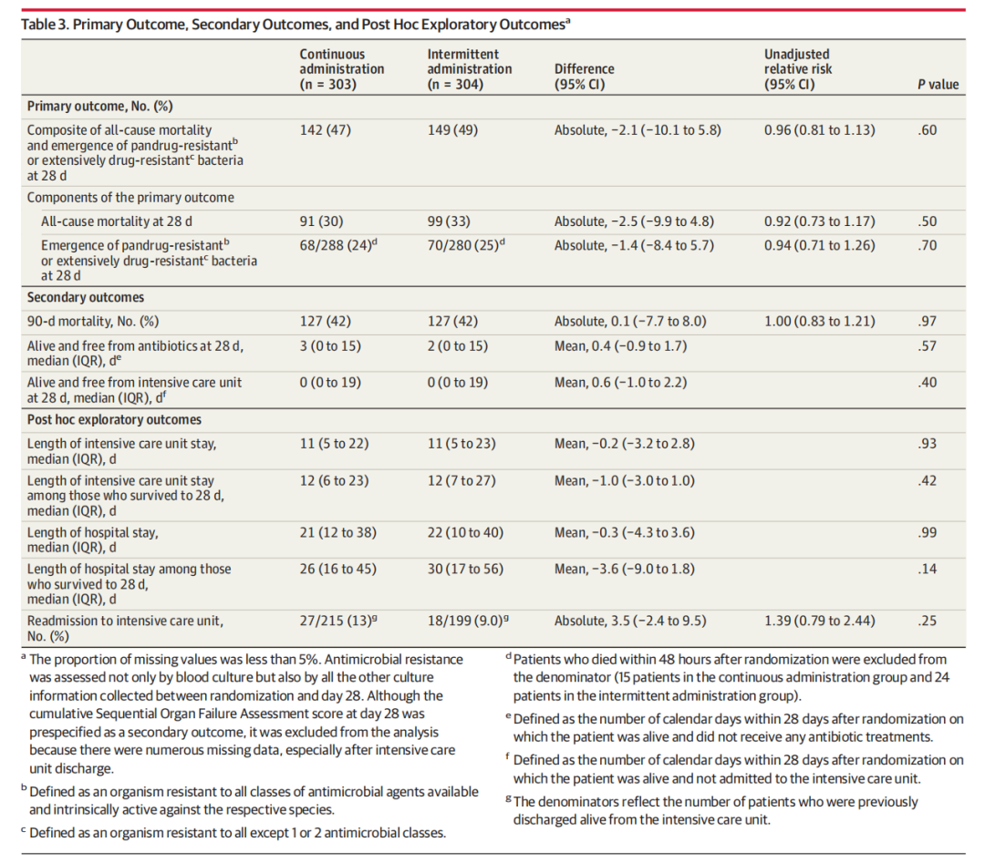 在脓毒症危重患者中,与间歇给药相比,美罗培南连续给药并未改善第28天死亡率和泛耐药或广泛耐药细菌出现的复合结局。