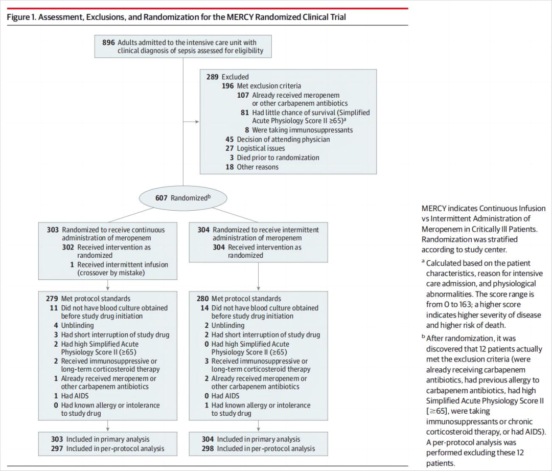 Patients were randomized to receive an equal dose of the antibiotic meropenem by either continuous administration (n = 303) or intermittent administration (n = 304).