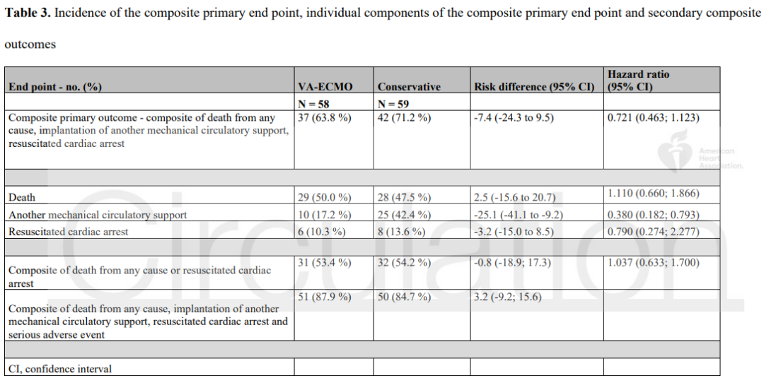 122例随机化患者中有5例因未签署知情同意书被排除,117例受试者被纳入分析,其中58例被随机分配至立即VA-ECMO组,59例被随机分配至不立即VA-ECMO组。在立即VA-ECMO组和不立即VA-ECMO组中,分别有37例(63.8%)和42例(71.2%)患者发生了复合主要终点(风险比,0.72; 95%置信区间为0.46~1.12; P=0.21)。23例(39%)不立即VA-ECMO组患者使用VA-ECMO。30天心脏骤停复苏成功(10.3.% vs. 13.6%;风险差异,-3.2; 95%置信区间为-15.0~8.5)、全因死亡(50.0% vs. 47.5%;风险差异,2.5;95%置信区间为-15.6~20.7)、严重不良事件(60.3% vs. 61.0%; 风险差异,-0.7; 95%置信区间为-18.4~17.0)、脓毒症、肺炎、卒中、下肢缺血和出血发生率在立即VA-ECMO组和不立即VA-ECMO组之间没有统计学差异。