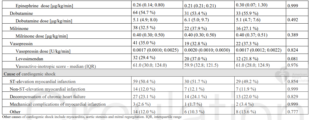 研究收集并比较两组患者一般临床资料及指标、主要终点事件(包含30天内全因死亡、心脏骤停复苏、实施其他机械循环支持情况)以及严重不良事件(脓毒症、肺炎、卒中、腿部缺血和出血)。结果表明,两组一般临床资料及指标比较均无统计学差异,如:年龄、既往病史(除外吸烟史有差异)、乳酸水平、平均动脉压、心率、有无主动脉内球囊反搏术、机械通气、肾脏替代治疗、血管活性药物剂量、心源性休克病因等。ECMO组和早期保守组两组中主要终点事件发生率分别为63.8%和71.2%,其中全因死亡率分别为50.0%和47.5%,心脏骤停复苏发生率分别为10.3%和13.6%,差异均无统计学意义;ECMO组相比于早期保守组,需要其他机械循环支持的患者占比更少(17.2%对比42.4%)。两组严重不良事件发生率分别为60.3%和61.0%,差异无统计学意义。进一步分层研究发现,早期保守组中39%的患者由于血流动力学进一步恶化而实施VA-ECMO支持,其中死亡占比达52.2%。分类心源性休克的类型(快速恶化型或严重型)及病因(是否由心肌梗死导致)进行统计分析,结果显示,ECMO组和早期保守组两组患者的主要终点和全因死亡发生率相当,不良反应两组间无差别,均无统计学差异。