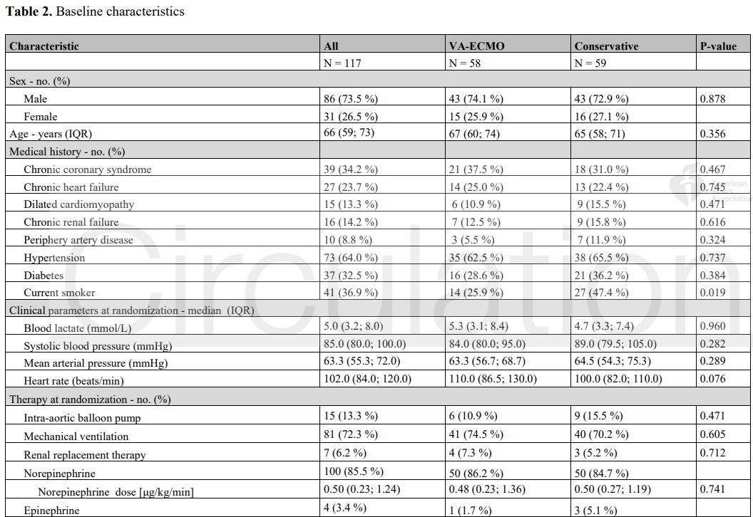 Veno-arterial extracorporeal membrane oxygenation (VA-ECMO) is increasingly being used for circulatory support in cardiogenic shock patients, although the evidence supporting its use in this context remains insufficient. The aim of the Extracorporeal Membrane Oxygenation in the Therapy of Cardiogenic Shock (ECMO-CS) trial was to compare immediate implementation of VA-ECMO vs. an initially conservative therapy (allowing downstream use of VA-ECMO) in patients with rapidly deteriorating or severe cardiogenic shock .