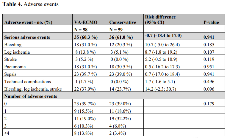 A total of 122 patients were randomized; after excluding 5 patients due to the absence of informed consent, 117 subjects were included in the analysis, of whom 58 randomized to immediate VA-ECMO and 59 to no immediate VA-ECMO. The composite primary endpoint occurred in 37 (63.8%) and 42 (71.2%) of patients in the immediate VAECMO and the no early VA-ECMO groups, respectively (hazard ratio, 0.72; 95% confidence intervals [CI], 0.46 to 1.12; P=0.21). VA-ECMO was used in 23 (39%) of no early VAECMO patients. The 30-day incidence of resuscitated cardiac arrest (10.3.% vs. 13.6%; risk difference [RD], -3.2; 95% CI, -15.0 to 8.5), all-cause mortality (50.0% versus 47.5%; RD, 2.5; 95% CI, -15.6 to 20.7), serious adverse events (60.3% vs. 61.0%; RD, -0.7; 95% CI, - 18.4 to 17.0), sepsis, pneumonia, stroke, leg ischemia, and bleeding was not statistically different between the immediate VA-ECMO and the no immediate VA-ECMO groups.