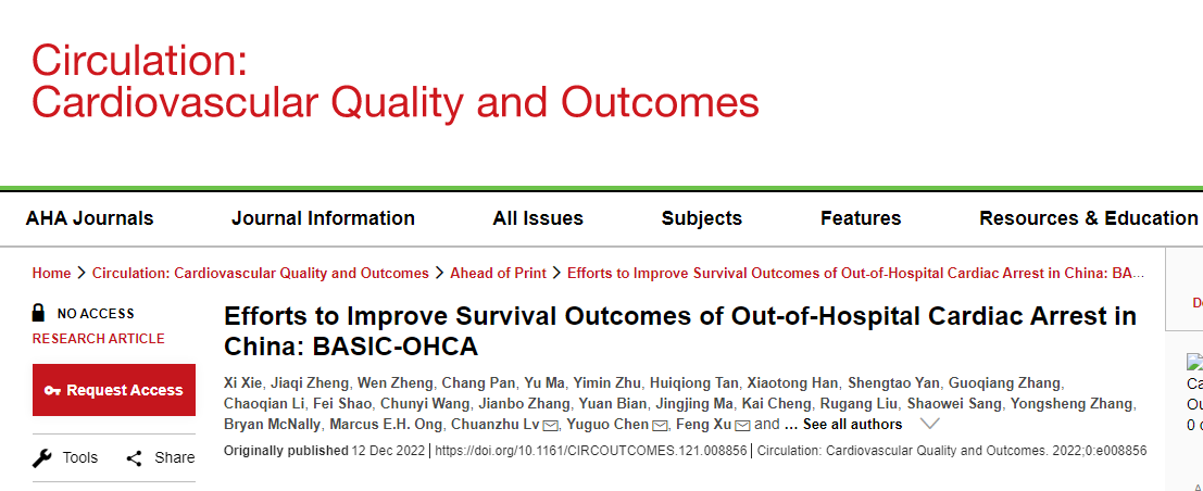 【本站讯】近日,山东大学齐鲁医院急诊科、山东省急危重症临床医学研究中心陈玉国教授和徐峰教授团队在Circulation子刊Circulation:Cardiovascular Quality and Outcomes(中科院一区,IF:8.271)发文“Efforts to improve survival outcomes of out-of-hospital cardiac arrest in China: the BASeline Investigation of Out-of-hospital Cardiac Arrest (BASIC-OHCA)”,介绍了由齐鲁医院急诊科团队牵头建立的国内首个全国性、前瞻性、基于人群的院外心脏骤停队列研究——“中国人群心脏骤停发病率、病死率及危险因素调查”院外部分(BASIC-OHCA)的设计、实施及运行情况。山东大学齐鲁医院陈玉国教授和徐峰教授、四川省人民医院吕传柱教授为本文共同通讯作者,谢熙、郑佳琪、郑雯为共同第一作者。